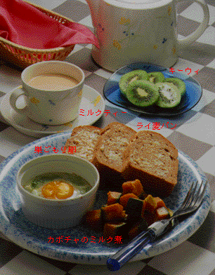 巣ごもり卵 卵 キャベツ サラダ油 塩 カボチャのミルク煮 カボチャ バター 牛乳・水 塩・スープの素 キーウィ ミルクティー 紅茶 牛乳 ライ麦パン バター |
