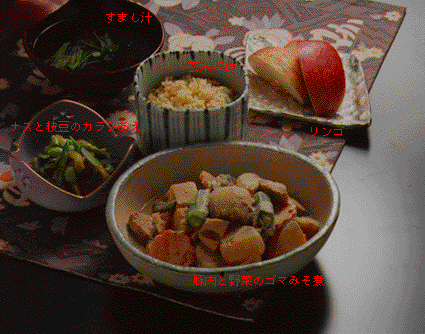 豚肉と野菜のゴマみそ煮 豚角切り肉 大根 ニンジン・ゴボウ レンコン・コンニャク 里芋 オクラ 酒 白炒りゴマ みそ 砂糖 だし汁 ショウガ ナスと枝豆のカラシあえ ナス 枝豆・サヤインゲン [A]練りガラシ しょうゆ・だし汁 すまし汁 だし汁 しょうゆ・塩 生ワカメ 貝割れ菜 リンゴ 玄米ご飯 |
