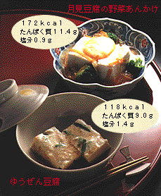 | 豆腐は消化もよく、良質のたんぱく質源。調理法もいろいろ変化がつけられる便利な食品です。魚は新鮮なものを。また肉は脂肪の少ないところを求め、いずれも加熱しすぎてかたくならないようにします。 |