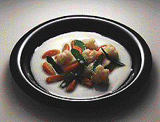 肉料理皮なし鶏肉で脂肪を少なく [鶏肉のフリカッセ] 224kcal たんぱく質18.7g 塩分1.5g ●材料 鶏皮なし胸肉70g 小麦粉小さじ1強 ニンジン30g サヤエンドウ20g カリフラワー40g 生クリーム小さじ2 白ワイン小さじ2 塩少々 サラダ油小さじ1 スープカップ1/4 バター少々 ●作り方 [1]鶏肉に塩少々をふり、小麦粉を薄くまぶしつける。 [2]鍋にサラダ油を熱し、[1]の肉を入れて両面を焼き、肉の色が変わったら、白ワインをふりかけ、スープを加えてふたをし、弱火で10分ほど蒸し煮にする。 [3]ニンジンは小指大に切って面取りし、バター、塩、ひたひたの水で柔らかく、汁けがなくなるまで煮る。 [4]カリフラワーは小房に分けて柔らかくゆで、サヤエンドウはすじをとって、色よくゆでておく。 [5][2]の鍋に[3]と[4]を加えて温める程度に煮、塩で味を調え、生クリームを加えてすぐに火からおろす。 ★鶏肉のかわりに子牛肉でもよい。 |