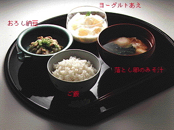 おろし納豆 納豆 大根 アサツキ しょうゆ 練りガラシ 落とし卵のみそ汁 卵 小松菜 だし汁 みそ ヨーグルトあえ グレープフルーツ プレーンヨーグルト ご飯 |