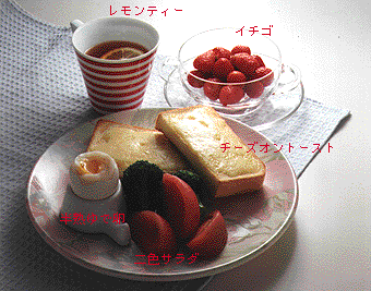 チーズオントースト 食パン 溶けるチーズ バター 二色サラダ ブロッコリー トマト フレンチドレッシング 半熟ゆで卵 イチゴ レモンティー |