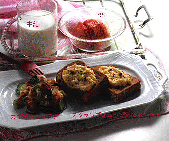 スクランブルエッグオントースト ●ライ麦パン マーガリン ●卵 牛乳 マーガリン 塩 パセリ カボチャのサラダ カボチャ キュウリ 玉ネギ ベーコン ドレッシング 桃 牛乳 |