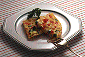 スクランブルエッグのかわりに[スペイン風オムレツ] 159kcal たんぱく質7.1g 塩分0.6g ●材料 卵50g トマト20g ピーマン10g 玉ネギ10g ジャガ芋30g サラダ油小さじ1強 塩小さじ1/10 パセリ少々 ●作り方 [1]ジャガ芋は1cm角に切ってゆでる。 [2]玉ネギは粗みじんに切る。トマトは皮をむいて種をとり、1cm角に切る。ピーマンも、種をとり1cm角に切る。 [3]フライパンにサラダ油を熱し、[2]を炒める。 [4]卵を割りほぐし、塩、[1]、[3]を混ぜる。 [5]小さめのフライパンにサラダ油を熱し、[4]を静かに流し入れる。ふたをして表面が半熟状になるまで弱火で焼く。パセリを添える。 |