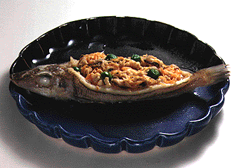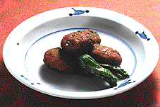 コレステロール低下にも効果的[サンマのつくね揚げ] 175kcal たんぱく質13.9g 塩分0.5g ●材料 サンマ60g [A](ショウガ汁少々 酒小さじ3/5 塩少々 しょうゆ小さじ1/3 砂糖少々 小麦粉小さじ1と1/3 溶き卵大さじ1/2) しし唐辛子10g 揚げ油適量 ●作り方 [1]サンマは三枚におろし、包丁で細かくたたく。 [2]すり鉢に[1]、[A]を入れてよくする。 [3][2]を小判形にまとめ、170度の揚げ油に入れ、からりと揚げる。 [4]しし唐辛子は竹串で穴をあけ、揚げ油で素揚げにする。 |