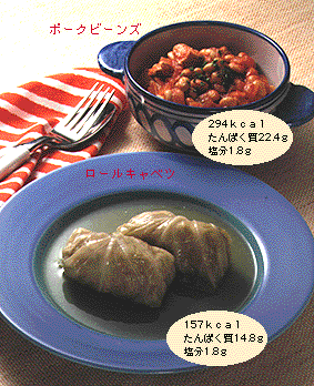 赤身の多い豚もも肉で[ロ−ルキャベツ] ●材料 キャベツ150g [A]{豚ももひき肉(脂身なし)}50g 玉ネギのみじん切り20g 生パン粉大さじ1と1/4 卵1/5個分 塩小さじ1/10強 コショウ少々} だし汁カップ3/4 塩小さじ1/10 しょうゆ小さじ1/2 みりん小さじ1弱 片栗粉小さじ2/3 ●作り方 [1]ボウルに[A]を入れ、よく練り混ぜ、2個の俵形にまとめる。 [2]キャベツは葉を破らないようにていねいにはがし、沸騰した湯でしんなりとする程度にゆで、芯(しん)をそぐ。 [3]キャベツを広げ、[1]をのせてきっちりと包み、鍋に重ならないように並べる。 [4][3]にだし汁、塩、しょうゆ、みりんを入れて火にかけ、煮立ったら火を弱め、ふたをして途中で汁が足りなくなるようなら補いながら25〜30分煮込む。 [5]ロールキャベツをとり出して盛り、残りの汁に倍量の水で溶いた片栗粉を加え、とろみをつけたものをかける。 ★3〜4人分まとめると作りやすい たんぱく質も繊維もとれる [ポークビーンズ] ●材料 大豆(乾)30g 豚もも肉(脂身なし)50g 玉ネギ50g サラダ油小さじ1と1/2 トマトジュースカップ1/4 トマトケチャップ小さじ1と1/3 固形スープの素1/4個 ウスターソース小さじ2/5 砂糖小さじ1 ローリエ少々 塩小さじ1/5 コショウ少々 ●作り方 [1]大豆はたっぷりの水に一晩つけ、柔らかくゆでる(またはゆで大豆を利用してもよい)。 [2]豚肉、玉ネギは1cm角に切る。 [3]鍋に油を熱し、[2]を入れて炒め、色が変わったらゆでた大豆を加える。トマトジュース、トマトケチャップ、スープの素、ウスターソース、砂糖、ローリエを加え、汁けがほぼなくなるまで煮込む。 [4]塩、コショウで調味する。 |