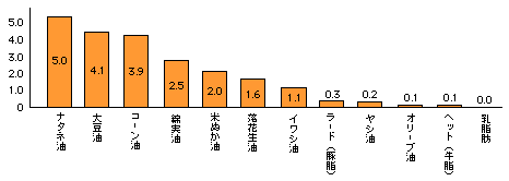 主な油脂のP/S比ランキング コレステロール値が高い人は、P/S比が高い食品を選ぶとよい P=多価不飽和脂肪酸(植物油に多い。血中コレステロールを低下させる作用がある)の総量、S=飽和脂肪酸(動物油に多い。血中コレステロールを上昇させる作用がある)の総量を示す。 |