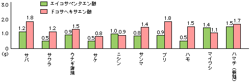 魚のEPA・DHA含有量(100g中) 魚の脂肪はコレステロールを下げる EPA(エイコサペンタエン酸)とDHA(ドコサヘキサエン酸)は多価不飽和脂 肪酸で、コレステロール低下作用や血栓(けっせん)の生成を予防する働きがある。 |