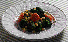 繊維とビタミンA・Cがいっぱい[ブロッコリーとコーンのサラダ] 123kcal たんぱく質5.8g 食物繊維3.3g ●材料 ブロッコリー80g ホールコーン20g ニンジン30g ドレッシング大さじ1弱 レモン汁少々 ●作り方 [1]ブロッコリーはゆでて小房に分ける。コーンはゆでて水けをきる。 [2]ニンジンは5mm厚さの輪切りにして面取りをし、柔らかくゆでて水けをきる。 [3]ドレッシングで[1]、[2]をあえて混ぜ、レモン汁を絞りかける。 |