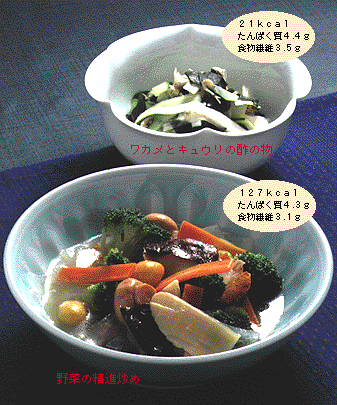 ジャコは貴重なミネラル源[ワカメとキュウリの酢の物] ●材料 生ワカメ30g チリメンジャコ5g キュウリ20g ウド20g 酢小さじ2 しょうゆ小さじ1 ショウガ汁少々 ●作り方 [1]ワカメは熱湯に通して色をさえさせてから、一口大に切る。 [2]チリメンジャコは熱湯をサッとかける。 [3]キュウリ、ウドは短冊切りにする。 [4]酢、しょうゆ、ショウガ汁を合わせ、[1]〜[3]をあえる。 あり合わせの野菜で [野菜の精進炒め] ●材料 大根50g ニンジン20g ブロッコリー30g タケノコ20g 干しシイタケ大1枚 マッシュルーム20g ギンナン2個 サラダ油小さじ2 [A](スープ大さじ2 塩小さじ1/4 砂糖小さじ2/3 酒小さじ1強) 片栗粉小さじ1/3 ●作り方 [1]大根、ニンジンは皮をむいて短冊に切り、ゆでる。 [2]ゆでたタケノコ、もどした干しシイタケは薄く切る。 [3]ブロッコリーはゆでて小房に分ける。ギンナンは殻を割り、薄皮をむく。 [4]フライパンにサラダ油を熱し、[1]、[2]とマッシュルームを炒め、[A]を加える。煮立ったら1〜2分炒め、[3]を加え、水溶きの片栗粉でとろみをつける。 |
