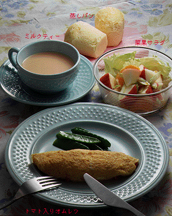 トマト入りオムレツ 卵 トマト ホールコ−ン(缶詰) サヤエンドウ サラダ油 塩 菜果サラダ リンゴ ミカン セロリ レタス フレンチドレッシング レモン汁 蒸しパン 小麦粉 卵 牛乳 バター 砂糖 ベーキングパウダー ミルクティー 牛乳 紅茶 砂糖 |