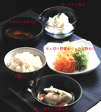 落とし卵のユズあんかけ 卵 だし汁 しょうゆ みりん 片栗粉 ユズの皮 せん切り野菜のショウガ酢かけ セロリ・ニンジン キュウリ おろしショウガ しょうゆ 酢・だし汁 ヨーグルトあえ リンゴ プレーンヨーグルト ミントの葉 カボチャのみそ汁 カボチャ だし汁 みそ シソの葉 ご飯 |