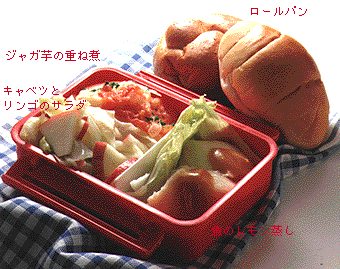 レモンやピーナッツの風味がきいた[パンのお弁当セット] 528kcal たんぱく質23.0g 塩分2.7g 魚のレモン蒸し ●作り方 [1]ヒラメは2つに切り、塩、白ワインをふって、蒸気の上がった蒸し器に入れ、8分くらい蒸す。 [2]マヨネーズとピーナッツバターをよく混ぜ合わせる。 [3][1]の魚にレモン汁をふり、[2]のソースをかけ、レタスとともに詰める。 ジャガ芋の重ね煮 ●作り方 [1]ジャガ芋は5mm厚さの半月切り、玉ネギは薄切り、トマトは皮と種をとり、粗く切る。 [2]鍋に[1]を重ねて入れ、マーガリン、塩、コショウ、ひたひたの水を加えて火にかけ、煮立ったら弱火にして、ジャガ芋が柔らかく、汁けが少なくなるまで煮、刻みパセリをふる。 キャベツとリンゴのサラダ ●作り方 [1]キャベツはゆでて短冊に切り、セロリはすじをとって斜めに薄く切る。 [2]リンゴは4mm厚さに切る。 [3]ドレッシングで[1]と[2]をあえる。 |