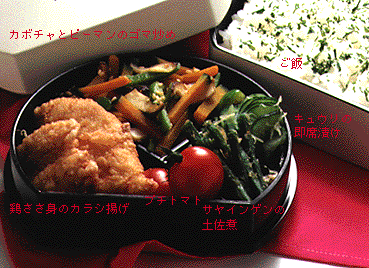 鶏ささ身のカラシ揚げ 鶏ささ身 練りガラシ しょうゆ 酒 片栗粉 揚げ油 カボチャとピーマンのゴマ炒め カボチャ ピーマン 生シイタケ 白炒りゴマ サラダ油 酒 塩 キュウリの即席漬け キュウリ ショウガ・塩 サヤインゲンの土佐煮 サヤインゲン しょうゆ みりん カツオ節(削り節) プチトマト ご飯 青ノリ |
