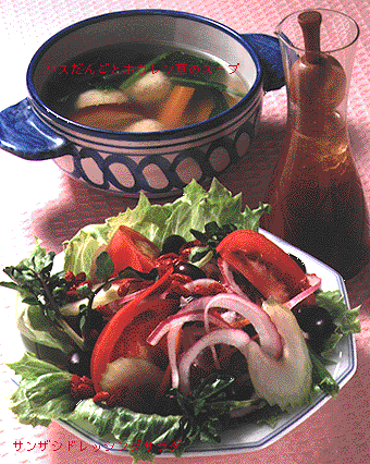 レタス、トマト、ニンジン、セロリ、紫玉ネギ、セリ、酢づけの黒大豆を彩りよく盛り、砕いたサンザシ、リンゴ酢、ベニバナ油、レモン汁、コショウ、塩、クコの実をよく混ぜ合わせたドレッシングをかける。