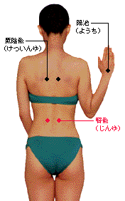 低血圧症の特効ツボ 最も効果のあるツボ 腎兪――体質改善に役立つ 治療のコツ 第2腰椎棘突起(だい2ようついきょくとっき)の下から左右へ手の指幅2本分のところのツボを、親指の関節を直角に曲げ、指先で強く押す。