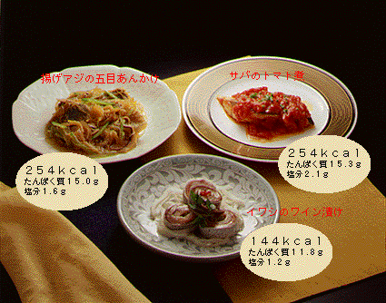 トマトの風味で塩味をカバー[サバのトマト煮] ●材料 サバ1切れ(70g) 長ネギ20g トマトの水煮缶100g アサツキ5g 小麦粉小さじ1 油小さじ1強 塩小さじ1/10 [A](酒大さじ1 しょうゆ小さじ1 砂糖小さじ1/3) ●作り方 [1]サバは骨を除いて塩をふり、水けをふいて小麦粉をまぶす。 [2]長ネギはみじん切り、トマトは缶から出して、粗く切る。 [3]油で[1]の両面を焼き、[2]を加え、[A]で調味してふたをし、5〜6分煮て、アサツキの小口切りを散らす。 くさみを消して洋風に [イワシのワイン漬け] ●材料 イワシ60g(1尾半) 玉ネギ30g レモン少々 パセリの軸少々 [A](白ワイン小さじ2 酢大さじ1/2強 赤唐辛子・ローリエ・マスタード各少々) ピクルス5g 塩小さじ1/4 あればセルフィーユ ●作り方 [1]イワシは三枚におろす。 [2]玉ネギは薄切り、レモンは薄い輪切りにする。 [3][A]を合わせて煮立て、さます。 [4]底の平らな器にイワシの半量を並べ、[2]の半量を散らし、塩1/2量をふる。残り半量でもう一度くり返し、[3]とパセリの軸を入れ、ラップをかけて冷蔵庫に入れて1〜2日おく。 [5]ピクルスは4〜6つ割りにする。 [6]漬けておいたイワシをとり出し、皮をむいて、手前にピクルスを置き、くるりと巻いて半分に切る。 [7]器に[4]の玉ネギを敷き、[6]の切り口を上にして盛り、青みを飾る。 栄養のバランスのよい [揚げアジの五目あんかけ] ●材料 アジ70g 塩小さじ1/7 小麦粉小さじ1 玉ネギ30g ニンジン・ゆでタケノコ各20g 干しシイタケ1枚 サヤエンドウ10g サラダ油小さじ1 [A](だし汁カップ1/4 しょうゆ小さじ1 みりん小さじ2/3) 片栗粉小さじ2/3 揚げ油適量 ●作り方 [1]アジは小さいものは腹わた、えらをとり、大きければ三枚におろして、そぎ切りにする。 [2][1]に塩をふり、小麦粉をまぶして170度の揚げ油でからりと揚げる。 [3]玉ネギは薄切り、ニンジンはせん切り、タケノコ、もどした干しシイタケは薄切りにする。 [4]サラダ油で[3]を炒め、[A]を加えて煮、ゆでて斜め切りにしたサヤエンドウを加え、水溶き片栗粉でとろみをつける。 [5]器に揚げアジを盛り、[4]をかける。 |
