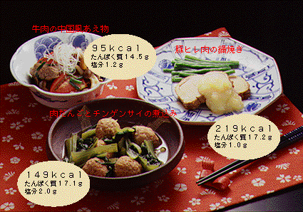 | 動物性脂肪を減らすため、肉類は脂身を除いた赤身の部分を用い、ゆでる、蒸す、焼くなど、肉の脂肪を外に出す調理をします。同時に野菜やキノコ類もとるようにします。 |