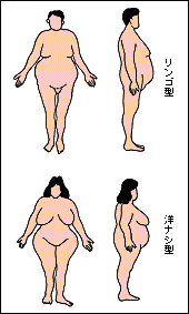 肥満の2つの型 リンゴ型はおなかに脂肪がつくタイプ。成人病にかかりやすく男性に多い。洋ナシ型は女性に多く、下半身が太る |