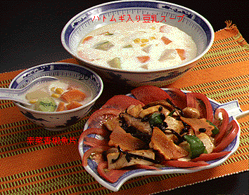 良質な植物性たんぱく質がとれる[ハトムギ入り豆乳スープ] ●材料と作り方(4人分) ハトムギカップ1/2は一晩水につけて、チキンスープカップ8に入れて煮、トウガン200g、ニンジン1/2本、トウモロコシ(粒)カップ1を加えて煮、さらに豆乳カップ2を加えて沸騰させないように煮、塩、コショウで調味する。 ノーエネルギーのキノコ類を入れた [素菜青椒魚片(スーツァイチンジャオユイピェン)] ●材料と作り方(4人分) サラダ油でピーマン4個、ニンジン1本、キクラゲ大1枚、もどした干しシイタケ3枚、フクロタケ12個、豆鼓(トウチ)大さじ2を炒め、フライパンで焼きつけた押し豆腐1丁を加えて炒め合わせ、ゴマ油、カキ油、コショウで味を調え、シイタケのもどし汁で溶いた片栗粉でとろみをつけ、トマトの薄切りの上に盛る。 |