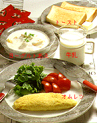 オムレツ 卵 塩 サラダ油 ミニトマト プリーツレタス ヨーグルトあえ パイナップル缶 プレーンヨーグルト 牛乳 トースト 食パン バター |