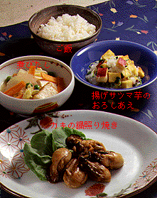 カキの鍋照り焼き カキ みりん しょうゆ サラダ油 サラダ菜 煮びたし 生揚げ 白菜 ニンジン グリンピース(冷凍) サラダ油 [A]だし汁 しょうゆ みりん 揚げサツマ芋のおろしあえ サツマ芋 揚げ油 貝割れ菜 大根 [A]酢 砂糖 塩 ご飯 |