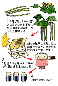 果実は完熟するとさやが割れてしまうので、採取はその直前にします。採った果実は刻み、乾燥させてから煎じます。