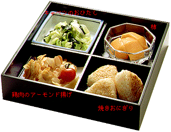 昼食制限食も懐石風の盛りつけで楽しく [焼きおにぎりセット] 682kcal たんぱく質25.2g 塩分1.1g 鶏肉のアーモンド揚げ ●作り方 [1]鶏肉はそぎ切りにして酒、塩をふる。 [2][1]に片栗粉と卵白を混ぜ合わせたころもをつけ、スライスアーモンドをまぶす。 [3]170度の揚げ油で[2]を色よく揚げる。 キャベツのおひたし ●作り方 [1]キャベツはゆでて短冊に切り、ワカメは熱湯に通して一口大に切る。 [2]セロリは短冊に切る。 [3]練りガラシ、しょうゆを混ぜ、[1]と[2]をあえる。 |