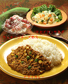 ドライカレー ご飯 豚ももひき肉(脂身なし) 玉ネギ スイートコーン・ニンジン サラダ油 グリーンピース トマトピューレ 小麦粉 カレー粉 スープ 塩 マセドアンサラダ ジャガ芋 ニンジン プリーツレタス キュウリ チーズ マヨネーズ カッテージチーズあえ カッテージチーズ イチゴ 砂糖 |