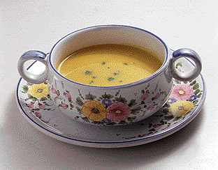 熱っぽいときに最適[カボチャの冷やしポタージュ] 122kcal たんぱく質3.0g 塩分0.9g ●材料 カボチャ80g 玉ネギ10g バター小さじ1 スープカップ1/2 牛乳カップ1/4 塩小さじ1/10強 パセリ少々 ●作り方 [1]カボチャは皮と種をとり、適当な大きさに切る。 [2]玉ネギは薄切りにする。 [3]鍋にバターを溶かし、玉ネギ、カボチャの順に炒め、スープと牛乳を入れ、カボチャがやわらかくなるまで煮る。 [4][3]をミキサーにかけるか裏ごししてなめらかにし、塩で調味する。 [5][4]を冷蔵庫にしばらく入れ、さましてから盛り、みじん切りにしたパセリをふる。 |