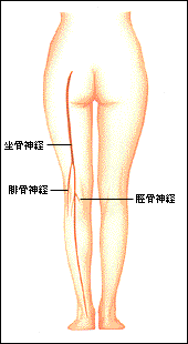 坐骨神経は最大最長の末梢神経(まっしょうしんけい)で、下部は腓骨神経(ひこつしんけい)と脛骨神経(けいこつしんけい)に分かれ、大腿後面から足にかけての知覚をつかさどっている