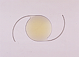 レンズ部分の直径は6mm前後。ループという2本のひも状の部分がバネの役をして、固定される。白内障の手術をすると、ものが青白く見えることがあるので、青みをカットするために、薄黄色に着色された眼内レンズも登場した。