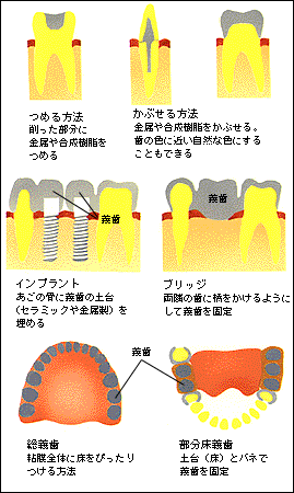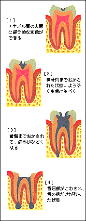 理想的なのは、図[1]の段階での治療です。悪い部分を削りとり、金属や合成樹脂をつめたりかぶせたりします。エナメル質だけの虫歯なら、麻酔もいりません。図[2]の場合も治療法は同じですが、歯髄の近くまで進んでいるときは、麻酔が必要です。