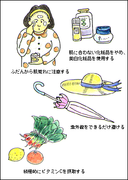 予防 最大の予防法は、紫外線をカットすることです。加えて、肌荒れ、かぶれなどのトラブルを避け、ビタミンC摂取に努めます。