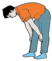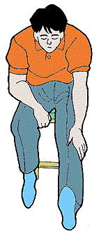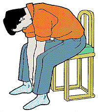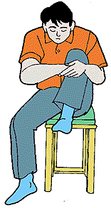 1 座位腰曲げ 全身の力をぬき、開いたひざの間に前かがみになる |