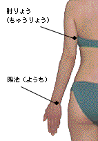 ツボの見つけ方 手のひら面の前腕のひじの関節で、小指側にあり、押すと小指にひびくところ。 治療のコツ 腕などの場合、軽いうちなら、自分で指圧してみるとよい。右手のツボは左手の、左手のツボは右手の親指でしっかり押す。パラフィン浴も効果的。市販のパラフィンを鍋で熱し、50度くらいになったら、患部をつけたり出したりする。 |