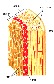骨は外側のかたい皮質骨と内側のやわらかい海綿骨の2層からなっており、表面は骨膜のうすい層に覆われている。骨髄には血液や抗体をつくる機能がある