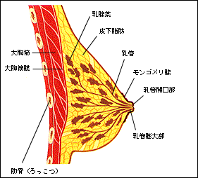 乳房は、皮下脂肪組織と乳腺組織からできている。月経周期のホルモンの変動に伴って、乳腺の状態は常に変化する