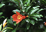 [生薬名] 安石榴(あんせきりゅう) [特徴] 庭木としてよく見られる樹木。高さは5〜6mになる。小枝には卜ゲがある。梅雨のころ朱色の花が咲く。球形の果実は秋になって熟すと裂け、種子があらわれる。 [薬用部と薬効] 幹、枝、根皮――虫下し 果実――うがい薬、口内炎 [採取と用い方] 皮をはいで乾燥させたもの、果実、ともに煎(せん)じる。服用あるいは外用する。