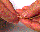| [3] 細長くしたところ。良質なもぐさはやわらかく、きめ細かで淡黄色をしていて、火もつきやすい | [4] もぐさを左手に持ち、その先端を米粒大くらい出して切りとる。それを円錐形にしてツボにのせる | |