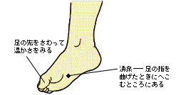 内臓の不調や体力の減退は、足の裏にあらわれます。体の中を通る経絡(けいらく)のうち、内臓を通る1本が、足の裏につながっているからです。その経絡の上に湧泉(ゆうせん)というツボがあります。泉が湧(わ)き出るようにエネルギーが湧いてくる名穴といわれています。ここを指圧や指ハリで刺激すると、内臓の働きが活発になってきます。 また、足の先をさわってみて、その温かさが、ひたいの温かさと同じくらいに感じられるときは、健康な証拠です。 差があるときには、内臓のどこかにエネルギーの滞りがあるということです。 |