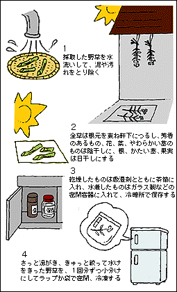 採取した野草は、新鮮なうちに処理しましょう。鮮度が落ちると薬効成分が低下してしまうからです。手際よく処理して、分類・保存しておきます。 干し方 センブリのように洗わないものを除き、水でていねいに泥と汚れ・農薬などを落とします。40度以下のぬるま湯でさっと湯通ししてもよいでしょう。根や地下茎を利用する場合は、特に念入りに洗います。十分に水きりしたら、風通しのよい場所で乾燥させます。根や皮、幹、かたい茎、果実などは日干し、葉、やわらかい茎、花、つぼみなどは陰干しにするのが原則です。葉をもむとにおう草は、においがとばないよう陰干しにしますが、ドクダミだけは内服用を天日干しします。根や幹、枝などの大きいものは、乾燥前に細かく刻んでおきます。ムシロやゴザ、少量ならざるに広げ、途中で上下を返し、まんべんなく日に当てます。干すのは10〜14時くらいまでがよく、それ以降は湿気を吸うのでやめましょう。 雨や夜露にあてないよう気をつけて干しますが、カラカラに干し上がったところで一晩、外気にあて、少し湿気をもどします。こなごなに砕けて品質が低下するのを防止するためです。 乾燥後 細かく切ります。やわらかいものは手でもみ砕いてもよいでしょう。 保存 湿気に注意して、かびや虫の発生を防ぎます。厚手の丈夫な紙袋に入れ、直射日光が当たらず、風通し良好で、温度や湿度の変化が少ない場所に、吸湿剤とともに保管します。ビニール袋は空気の流通がないのでかびが生えやすく不適当です。茶筒やアルミ缶など湿気を寄せつけない容器に、吸湿剤とともに保存したり、梅雨期から夏は、冷蔵庫に保管してもよいでしょう。 紙袋や容器に、植物名と採取年月日を書いておき、衣類の虫干し同様、ときどき、袋から出して日に当てます。保存期間は1年間を目安にします。 その他の保存法 冷凍は、必要なときにすぐ使える手軽な保存法です。マイナス20度前後で急速冷凍すると、風味をそこなわずに長期保存できます。水煮は、軽くゆでてびん詰めにする方法。塩漬けはあら塩などで漬ける方法ですが長期間保存には向きません。 |