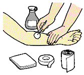 傷口を水で洗う。傷口の土や砂は強めの流水でとり除く。とれないときは、ガーゼで軽くこすりとる | |