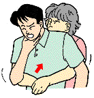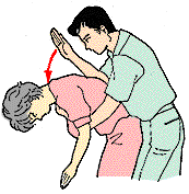 頭を低くさせ、胸に手をあて、もう片方の手で背中の肩甲骨の間を数回たたく