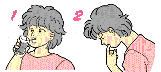 | 水をコップ4〜5杯飲み、毒物をうすめる。その後、のどに指を入れて吐く | 子供の場合、腹をひざにあて、頭を低くさせて指で吐かせる。水をコップ1〜2杯飲ませると吐かせやすい | |