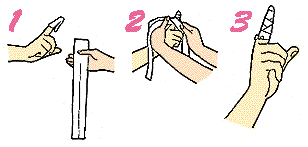 指 40cmほどの包帯を、10cmほど残して2つに切り、2本を交互に指に巻き、手の甲側で結ぶ |
