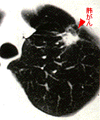 肺がんは、がんのなかでもことにCT検査によって解析がしやすい。3〜5mm程度の小さなものまで見つけることができる。写真の白い部分ががん。