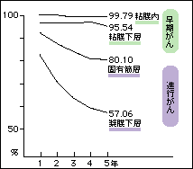 がんが治癒したかどうかは、手術後5年間生存したかどうかを目安にしています。これによると、早期の胃がんでは、5年生存率が95%以上という、高治癒率を示しています。早期のがんなら、まず手術によって治療できるといってよいでしょう。