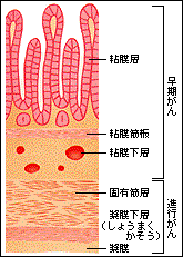 胃壁と胃がんの進行度 胃がんの進行度は、患部の大きさよりも深さによる。胃壁の粘膜下層までのがんを早期がん、さらに胃壁の外側深くに広がると、進行がんという |