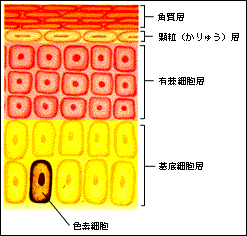 表皮のしくみ 皮膚は、表皮、真皮、皮下組織から成り立ち、表皮は上のような構造になっている。表皮の各部にできるがんのほか、汗腺(かんせん)や脂腺、毛嚢(もうのう)などにできるがんもある |